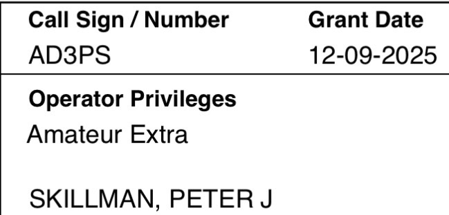 But contests don’t appeal as much to me. When I applied, I was trying to get a “1×3” that incorporated all three of my initials in the suffix. Unfortunately, I hit a snag because of the 2025 U.S. Federal Government Shutdown and the call sign that I wanted had it’s expiration date extended after I had applied. The call sign that I ended up with – which is still a very fine call sign – is AD3PS.