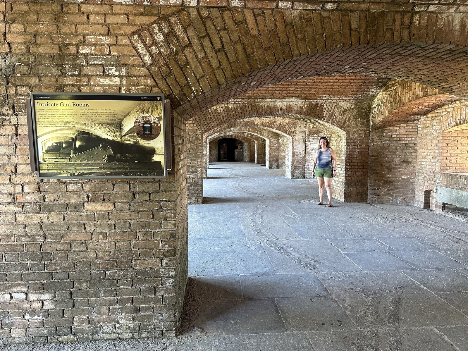 The view inside the fort from near the visitors center / gift shop. – Photo by the authorEmily in the casemates. – Photo by the author#RampartSelfie – Photo by the authorView from the rampart looking southwest. – Photo by the authorA Rodman gun. – Photo by the authorA large seacoast Parrott rifle. – Photo by the authorThe cell where Dr. Mudd was held. – Photo by the author
