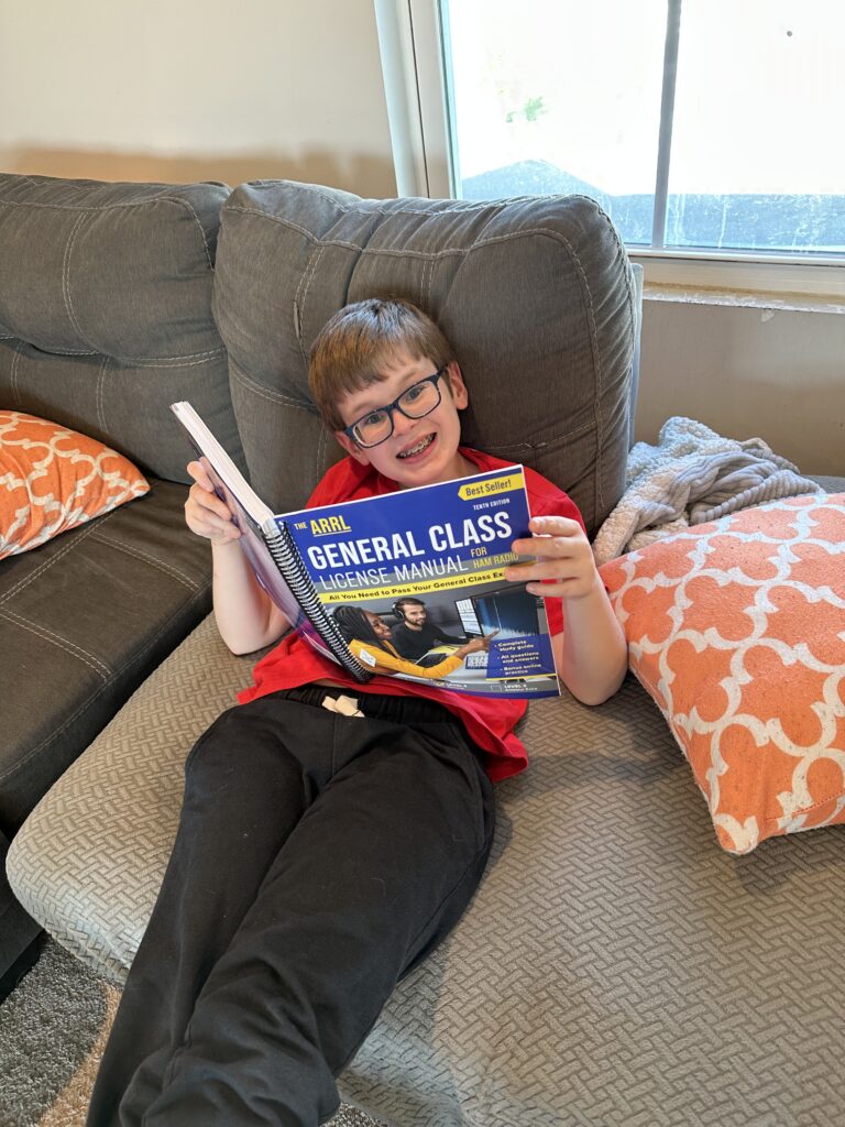As I was digging out my license paperwork so that I could complete my application, Isaac was looking over my shoulder. “What’s this radio license thing all about?” He was instantly intrigued. We had a few conversations about it, and his interest only grew. I told him he’d have to learn enough about radio and electronics to pass a license test. It would take some work, but he was up for it. The prospect of learning some science was exciting for him, so we ordered a book and got deep into studying.